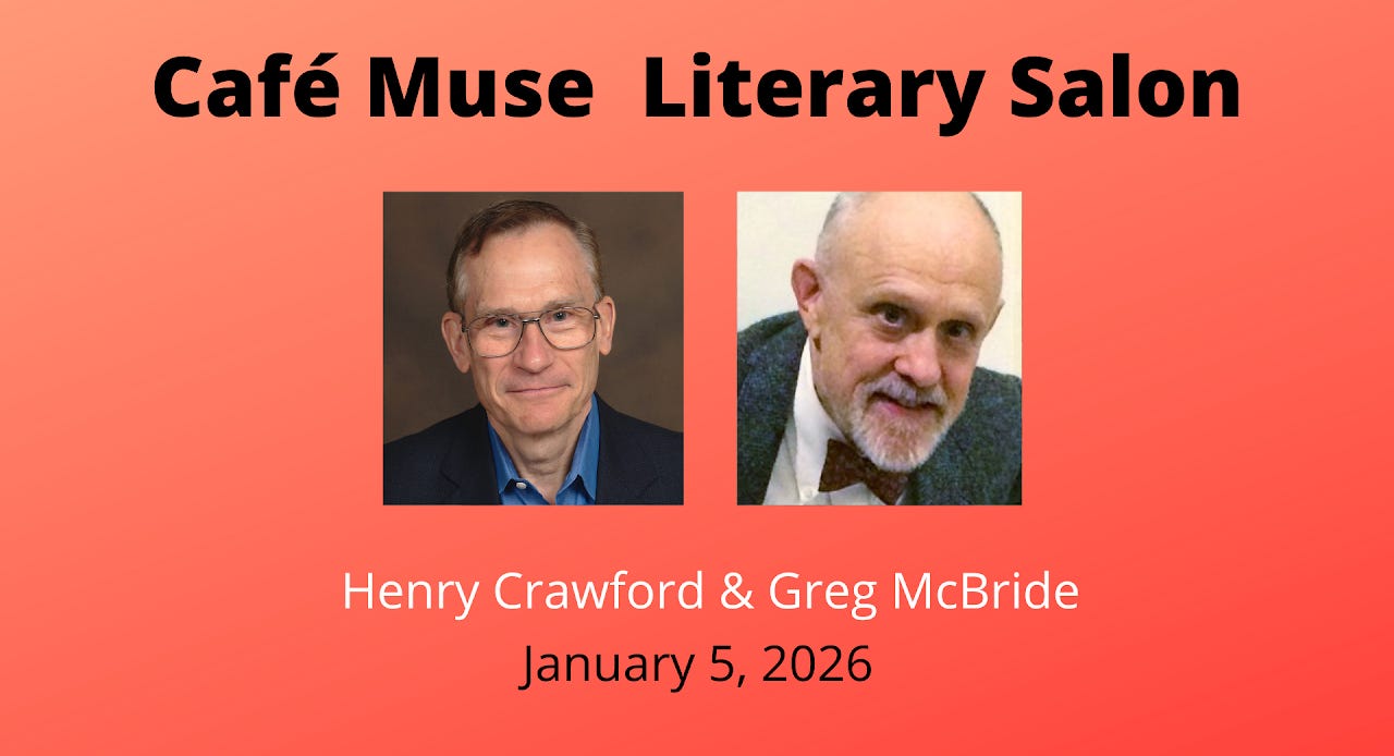 January 5, , 2026, at 7:00 pm at the Writer’s Center, Cafe Muse will present poets Henry Crawford and Greg McBride. The Writer’s Center is at 4508 Walsh Street, Bethesda, MD or join online through Zoom. There will be a brief open mic for live participants at the Writer’s Center. Register at: https://sites.google.com/view/cafe-muse-events/home.