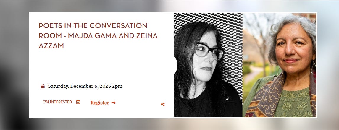 December 6, 2025, from 2-4pm. Poets in the Conversation Room featuring Majda Gama and Zeina Azzam Free and open to the public, ST Johns College of Annapolis Mellon Hall. Coffee, pastry, and poetry.