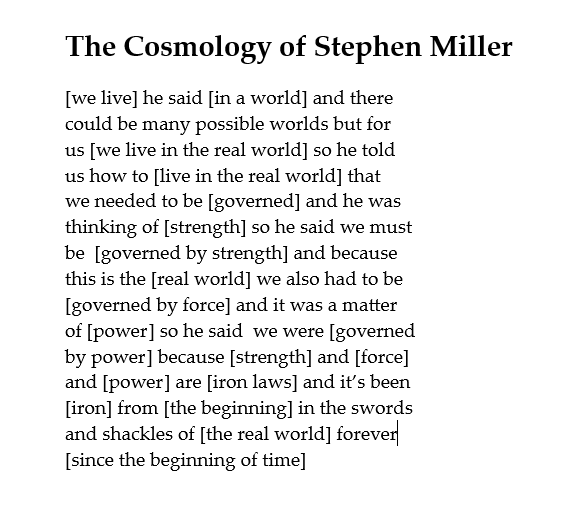 The Cosmology of Stephen Miller, unpacks this dark philosophy using the bracketing form I first developed years ago in my poem, It Does Kind of Burn Goodbye.